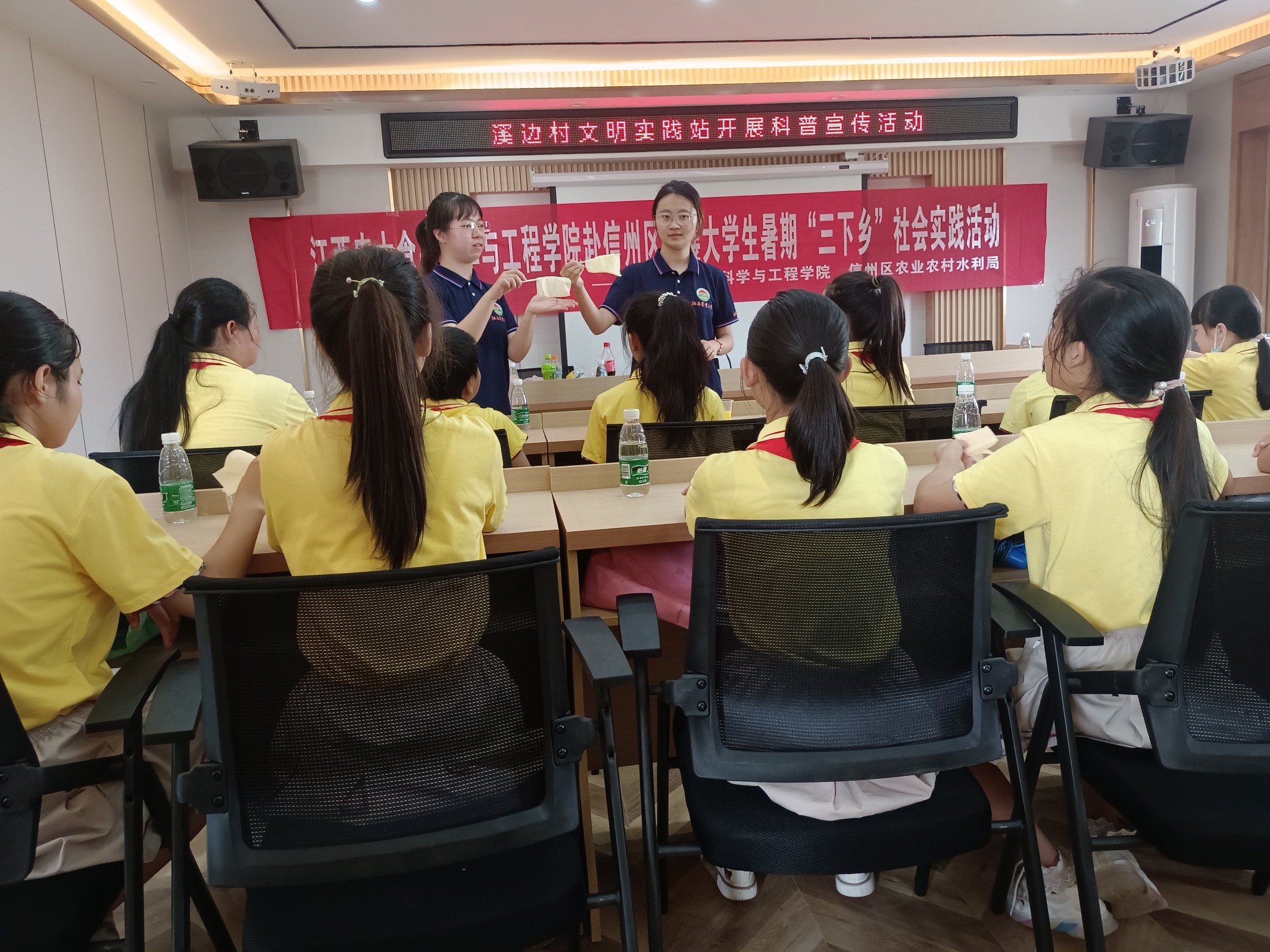 在信州区溪边村和月鹅小学,团队以关爱留守儿童为目标,结合所学专业特长,开展了体验式食品安全与营养小实验互动课堂、赠送文具、学业辅导、亲情陪伴、素质拓展、反诈宣传、安全自护和防溺水教育等志愿服务活动。队员们充当“老师”的角色,为当地的留守儿童讲解食品添加剂知识,带领小朋友们做起了“饮料变水”、“可乐沉淀”等实验。活动将知识性、趣味性相结合,让“娃娃”们手脑并用,近距离学习食品营养与安全知识,感受科学实验带来的快乐,引领小员工探索食品安全与营养的奥秘,引导孩子们少吃高脂高盐高糖和食品添加剂过多的加工食品,特别是“三无”食品,注意身体健康,增长了孩子们安全饮食、科学饮食、健康饮食知识,达到了寓教于乐的效果,受到了孩子们的热烈欢迎。