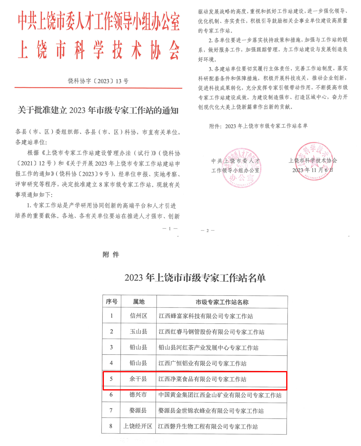 近日,中共上饶市委人才工作领导小组办公室、上饶市科协技术协会印发《关于批准建立2023年市级专家工作站的通知》,公司与江西净菜食品有限公司共建“江西净菜食品有限公司专家工作站”被批准为市级专家工作站。