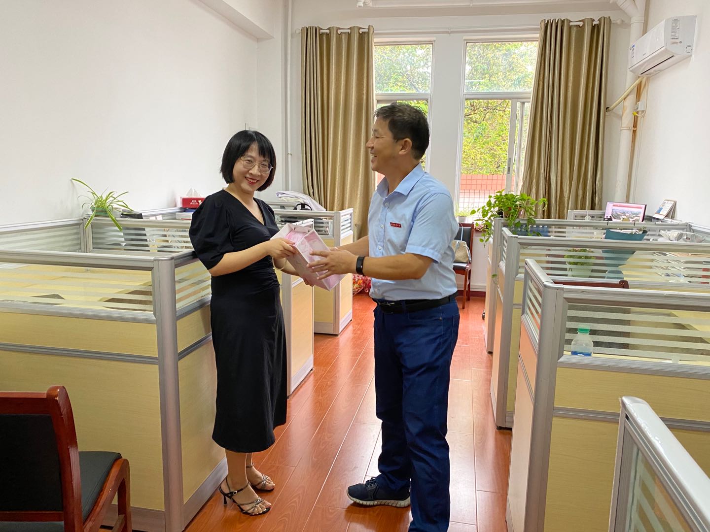 毛巾、护手霜、润喉糖、手工小玩偶,这是小小礼盒里的全部内容,却承载着公司工会对老师们的浓浓祝福。9月10日,公司工会组织开展了“礼赞教师节,致敬育书人”教师节活动,由公司党政领导将这些自制的“小礼盒”送达到每位老师手中,也将关怀与祝福送至每位老师的心里,致敬老师们为公司团队建设、人才培养中的辛苦付出。