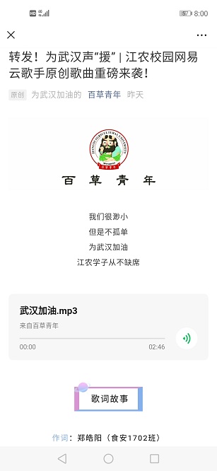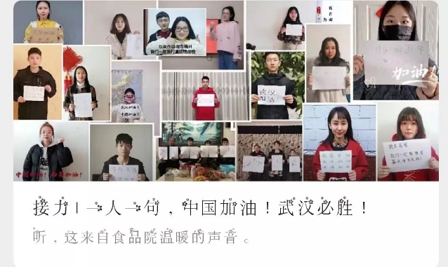 公司员工骨干以“一人一句线上接力”图文并茂的方式在院团学官方微信平台为武汉加油,传递着积极乐观的精神和必胜的信念,营造了团结奋进防控疫情的浓厚氛围。食安1702班郑皓阳同学录制原创说唱歌曲《武汉加油》“声援”武汉,向抗疫一线的“战士”致敬,得到校团委官方微信平台“百草青年”推送,发布仅1天时间阅读量就近3千。公司院友、上海巨匠咖啡食品有限公司总经理王君为抗疫一线医护人员捐赠大批咖啡等物资,以实际行动奉献爱心、勇担社会责任。